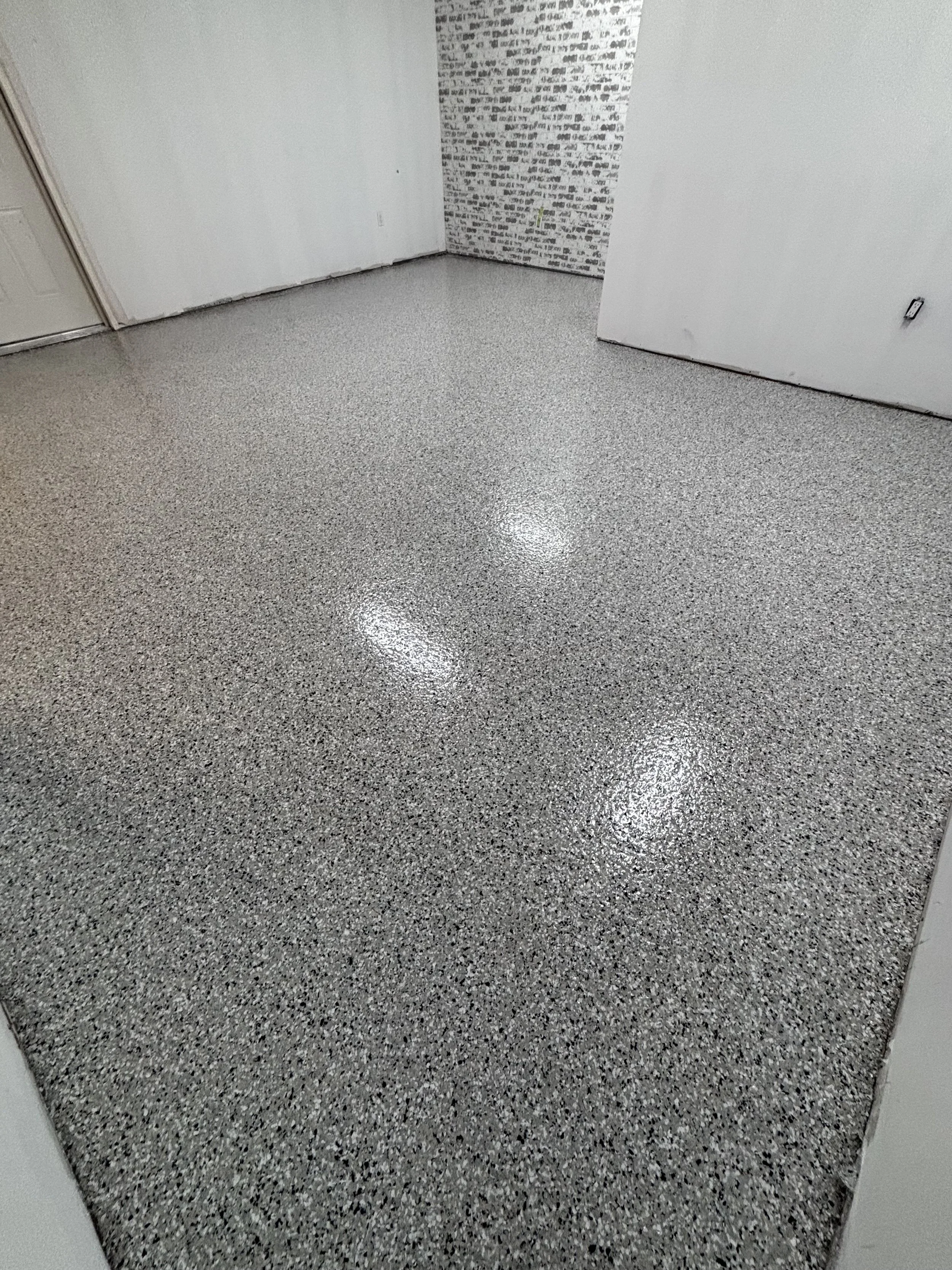 Once the surface was prepped, we installed the full Cabin Fever flake system and finished it with a polyaspartic top coat — one of the strongest, most impact-resistant finishes available. This final layer adds maximum protection against drops, abrasion, and heavy equipment while keeping the floor easy to clean and maintain.