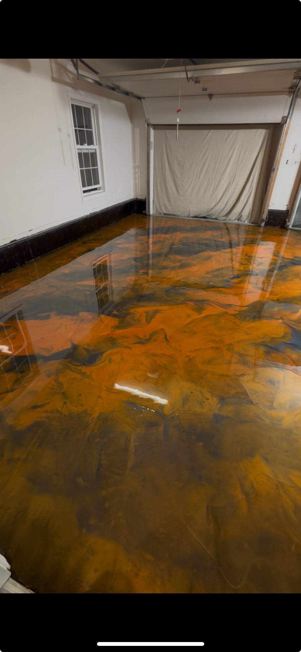 We recently completed a one-of-a-kind metallic epoxy project in Pennsylvania, transforming a standard two-car garage into a bold, fiery statement piece. The client wanted something truly unique — a floor no one else had ever seen. When we asked what colors they preferred, they told us, “I love fire colors… whatever you think, do it.” So we designed a fully custom metallic system using deep black and vibrant orange to mimic the look of flowing lava.